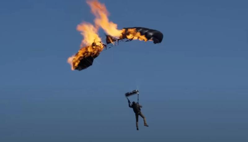 Речь идет о сцена, когда Итан Хант в исполнении Тома Круза достает парашют из поврежденного биплана и выпрыгивает наружу. Но его основной парашют загорается. Поэтому Хант срезает его и в последнюю секунду раскрывает запасной. В этом трюке нет компьютерных спецэффектов, в действительности актер выпрыгивал из вертолета с высоты более двух километров в Дракенсберге, Южная Африка, с основным парашютом, пропитанным горючим, который затем поджигался. Самое впечатляющее, что он выполнил этот чрезвычайно опасный трюк 16 раз.